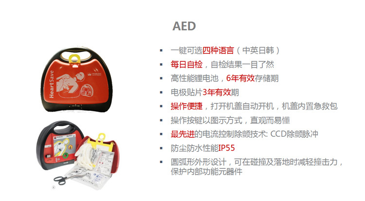 产品名称:半自动体外除颤器 品 牌:PRIMEDIC 型号规格:HeartSave AED(M250) 注册证号:国械注进20143085742 适用范围:该产品可进行半自动体外除颤治疗,对于无意识、无呼吸且无正常脉搏的疑似心脏骤停病人,终止其心动过速和心室颤动症状。